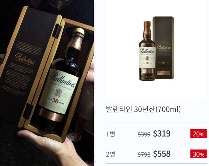 발렌타인 30년산의 면세 가격은 700ml기준 약 40만원 중반입니다.