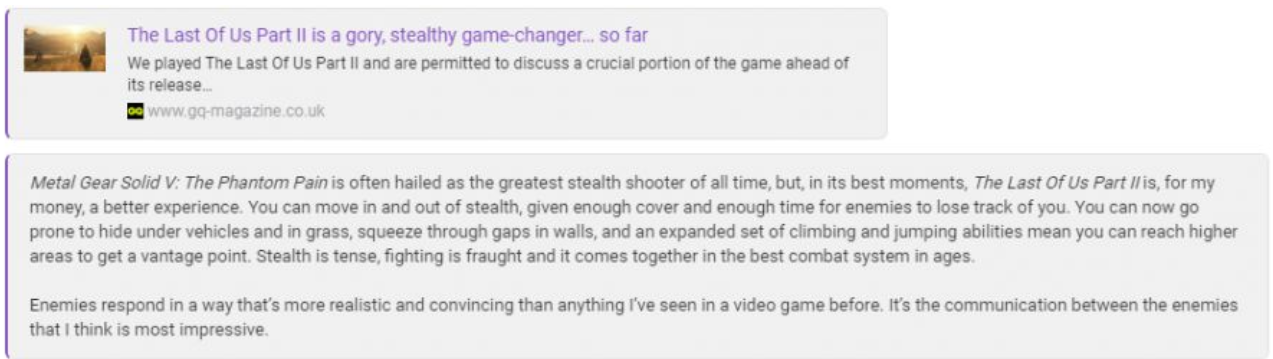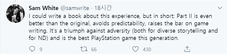 "나는 이 경험에 대해서 책을 쓸 수도 있었지만 간단하게 말해서, 파트 2는 전작보다 훨씬 더 좋고, 예측 가능성을 피하며, 게임의 집필 기준을 높인다. 이것은 역경과의 승리이며, 이번 세대 최고의 플레이스테이션 게임이다."