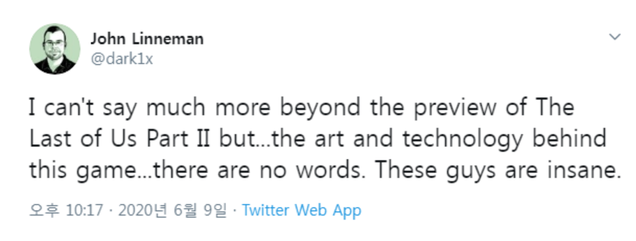 "라스트 오브 어스 파트2에 대해선 프리뷰 이상으로 언급할 수 없지만, 이 게임 배후의 미술과 기술은... 표현할 수 있는 단어가 없다. 너티독은 미쳤다."