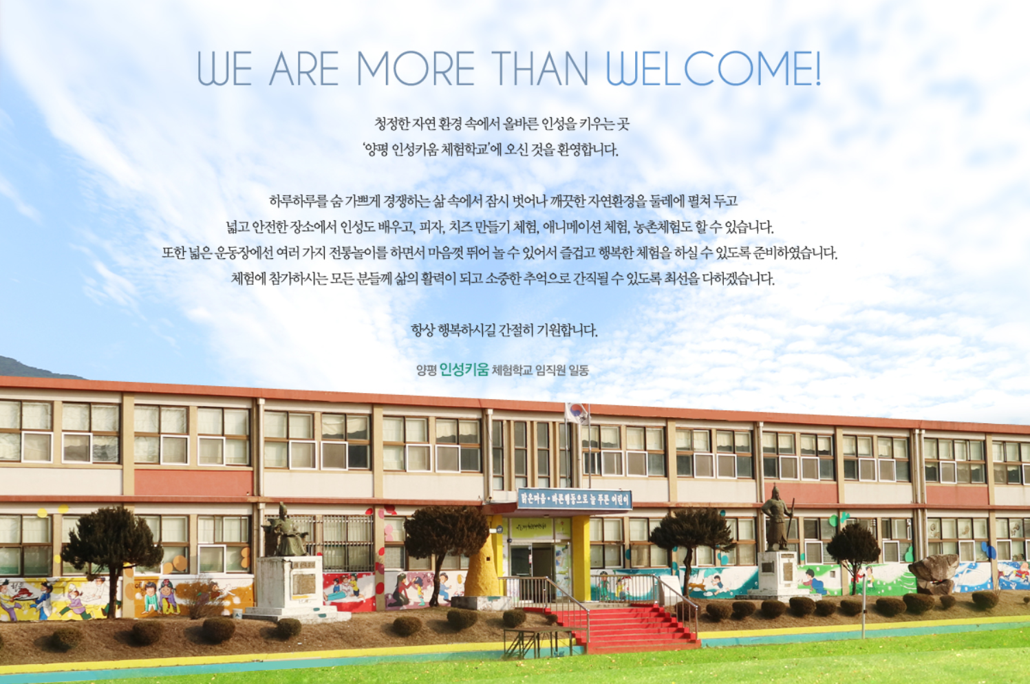 첫 번째 장소는 양평 소재의 인성키움체험학교입니다. 서울이나 근교에 거주하시는 분들은 한번쯤 가보기에 좋은 위치인 것 같습니다. 인성키움체험학교는 초등학교 건물인데, 현재는 폐교상태이며 문화체험활동지로 운영하고 있습니다. 검색창에 “양평 인성키움체험학교”라고 검색하시면 홈페이지도 나온답니다. 아래와 같은 사진이 반겨줍니다.